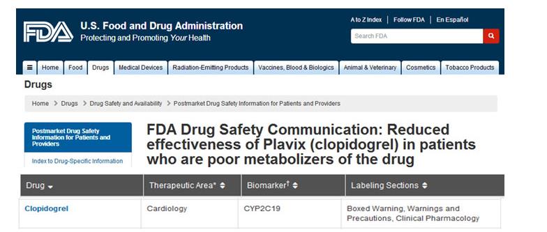 2010年FDA提出黑框警告,明確建議醫(yī)生對將要服用氯吡格雷的患者進行CYP2C19基因分型檢測,針對患者基因型實施個性化用藥。