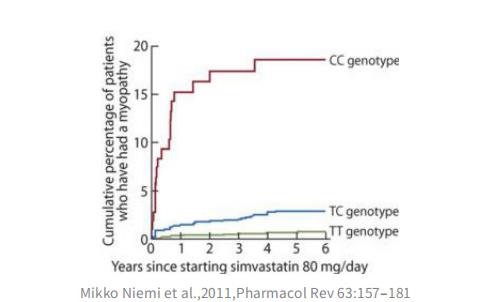CPIC藥物遺傳學指南和國家衛(wèi)計委頒布的《藥物代謝酶和藥物作用靶點基因檢測技術(shù)指南(試行)》中都指出:SLCO1B1和ApoE基因多態(tài)性影響他汀類藥物的代謝水平,醫(yī)生可根據(jù)其基因多態(tài)性,指導病人他汀類服用劑量,降低發(fā)生肌病的風險。研究表明,每日攝取相同量的辛伐他汀,SLCO1B1純合突變體內(nèi)他汀藥物濃度明顯高于野生型和雜合突變型,且發(fā)生肌病的概率也遠遠大于后者。